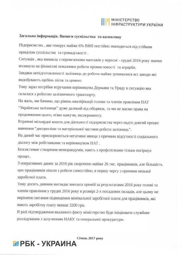 Документы, которые получил от министра Гройсман, посвящены анализу выполнения финплана УЗ на 2016 год. В ней также содержится документ под названием “Анализ выполнения дорожной карты относительно “быстрых побед” ПАТ “УЗ”” (РБК-Украина располагает копией документа).