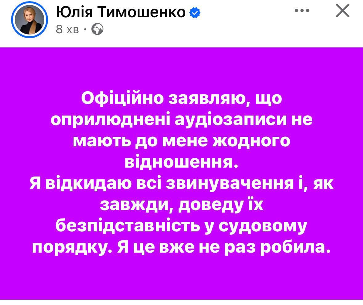 “Официально заявляю, что обнародованные аудиозаписи не имеют ко мне ни одного отношения. Я отвергаю все обвинения и, как всегда, докажу их безосновательность в судебном порядка. Я это уже не раз делала”, — написала Тимошенко в Фейсбуке.