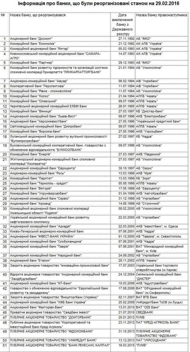 Национальный банк Украины опубликовал список всех банковских реорганизаций с 1992 года. Об этом сообщает FinClub.