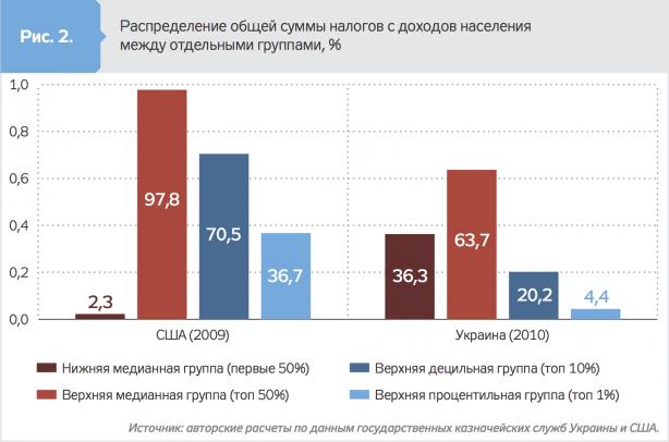 Наболее богатые 10% налогоплательщиков в Украине обеспечивают 20,2% общей суммы поступлений с населения, а в США — 70,5. Однако самая яркая разница во вкладе 1% наиболее зажиточных: в Украине вклад этой категории составляет 4,4% от общих поступлений, а в США — 36,7 (следует еще вспомнить, что в США представители верхней центили получают 35% общих доходов, а в Украине — 39).