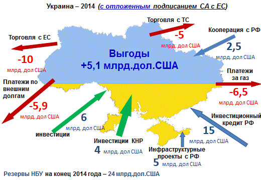 Согласно инфографике, представленной на русском языке, выгоды Украины-2014 благодаря отложенному соглашению об ассоциации составят $5,1 млрд. В качестве составляющих указаны $15 млрд кредит РФ, названный инвестиционным, инфраструктурные проекты и кооперация с РФ на $5 млрд и $2,5 млрд соответственно, инвестиции КНР $4 млрд и прочие инвестиции $6 млрд.
