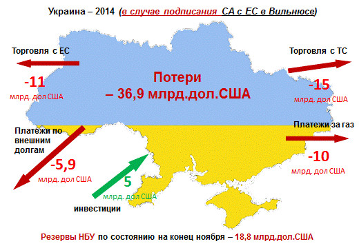 Суммарные же потери оцениваются в $36,9 млрд. Их составляющими названы дефицит в торговле с ЕС и Таможенным союзом — соответственно $11 млрд и $15 млрд, учитываемые по каким-то причинам отдельно платежи за газ — $10 млрд и платежи по внешним долгам $5,9 млрд.